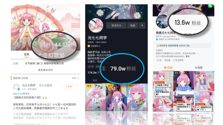 元七七在各主流平台粉丝数快速蹿升,总计已超过百万