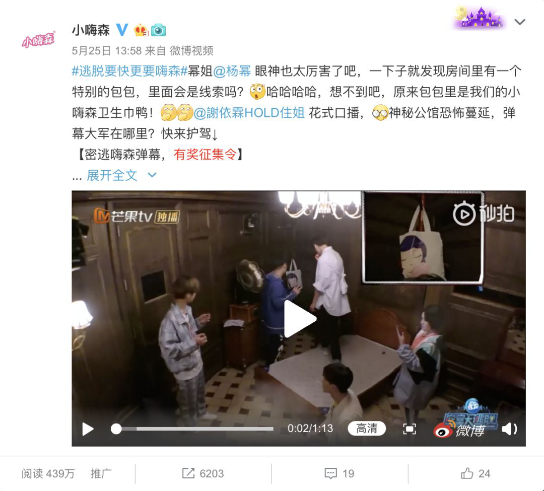 在的五月份25日当天,活动以双微发出品牌弹幕营销活动,打响营销第一枪,并进行有奖征集,号召粉丝到小嗨森出现在密逃的片段发射弹幕。视频中可以看到众明星发现密室中小嗨森的手提袋,里面有小嗨森的产品,新颖独特的巧设互动引发粉丝参与活动。