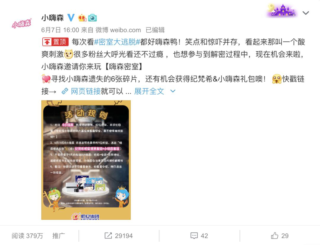这次小嗨森IP和有颜值、有双商、有体力、有活力的密逃团联合,可以很好地取得年轻消费者的好感,成功通过节目打开年轻消费群体的突破口。通过高流量的节目,高流量艺人话题发酵引流,使品牌获得可观的曝光度和关注度。