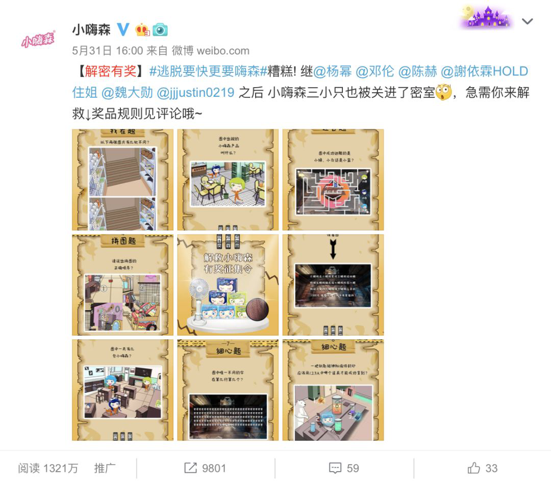小嗨森通过对每期热议明星话题的及时跟进,进行内容传播,并借力众明星为品牌抓取更多关注,利用粉丝引爆话题。灵活运用官方自媒体和优质KOL整合话题、引导粉丝讨论,令品牌效应升温。微博话题 #密室逃脱2要快重在嗨森#话题阅读量1.8亿人次,其中,单篇微博更创1400万阅读量高峰。