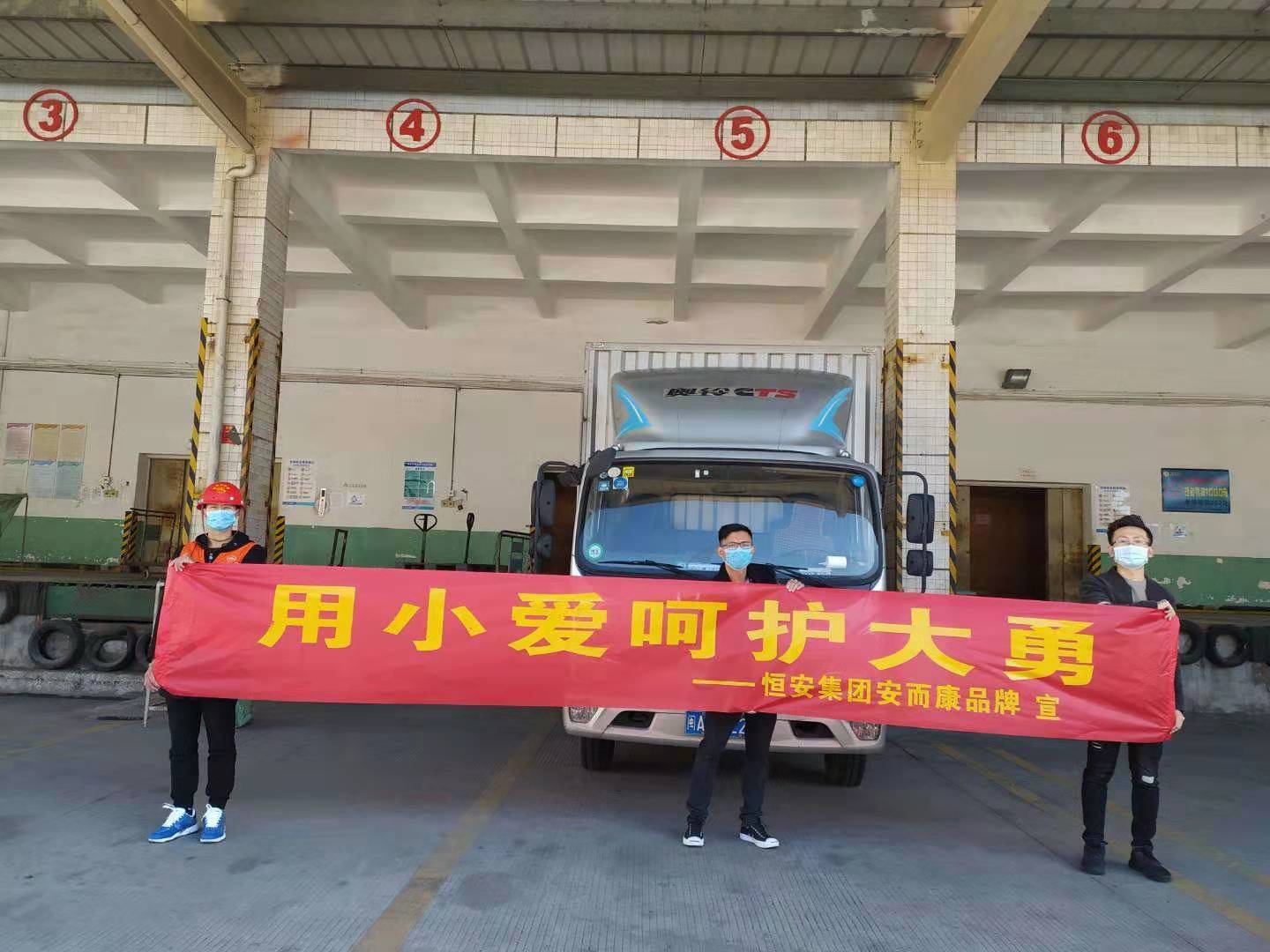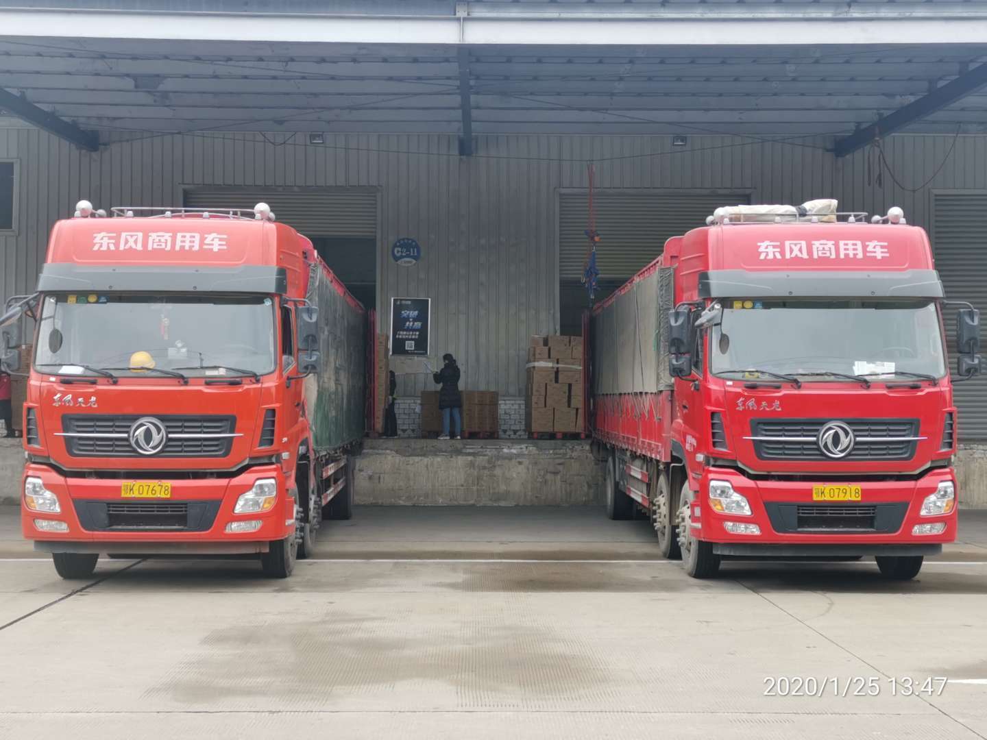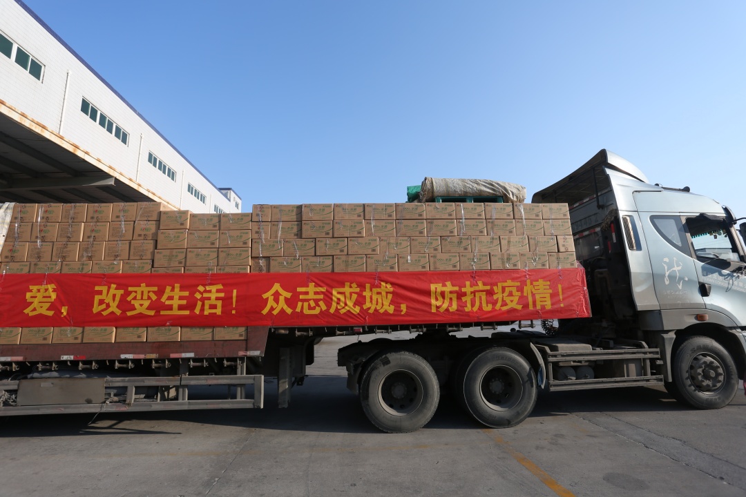 1月29日下午,满载物资的车辆陆续从彩神vll位于晋江五里工业园区的厂区发车。