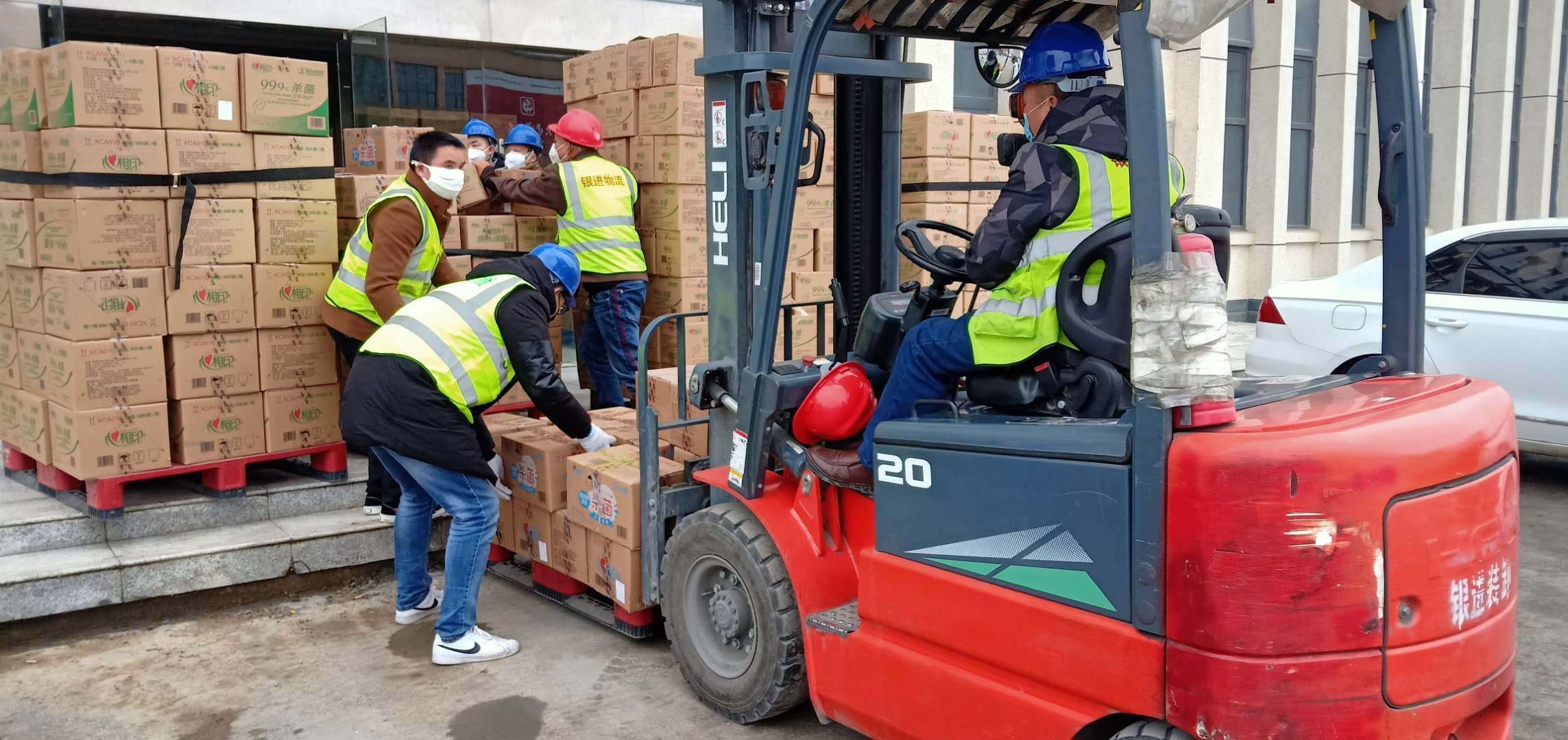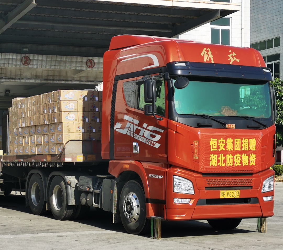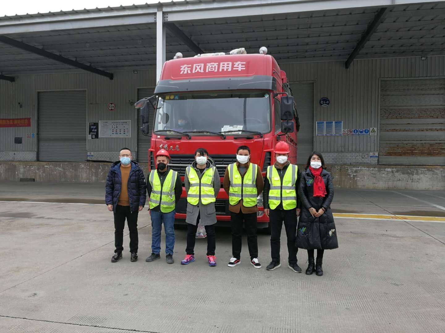1月29日下午,满载物资的车辆陆续从彩神vll位于晋江五里工业园区的厂区发车。
