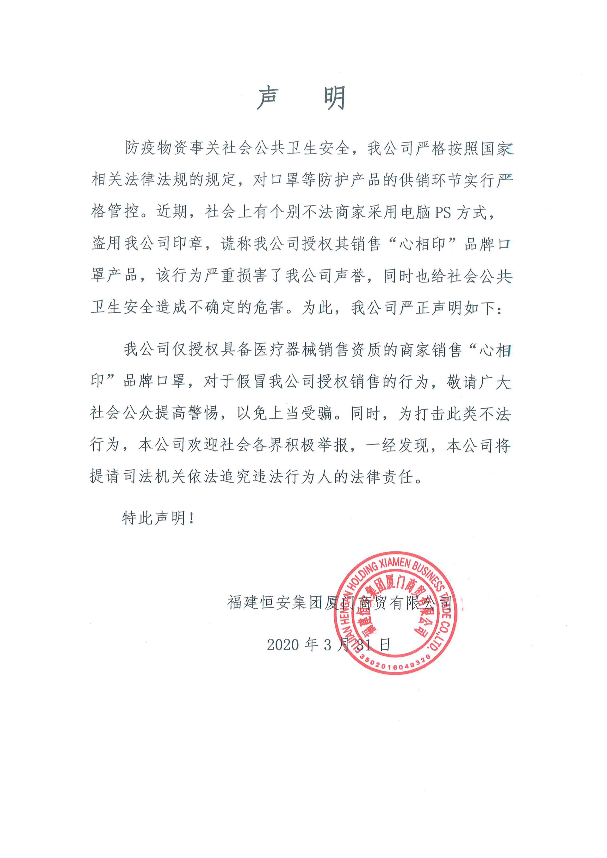 事件: 2021-03-31防疫物资事关社会公共卫生安全,我公司严格按照国家相关法律法规的规定,对口罩等防护产品的供销环节实行严格管控。近期,社会上有个别不法商家采用电脑PS方式,盗用我公司印章,谎称我公司授权其销售“心相印”品牌口罩产品,该行为严重损害了我公司声誉,同时也给社会公共卫生安全造成不确定的危害。为此,我公司严正声明如下: